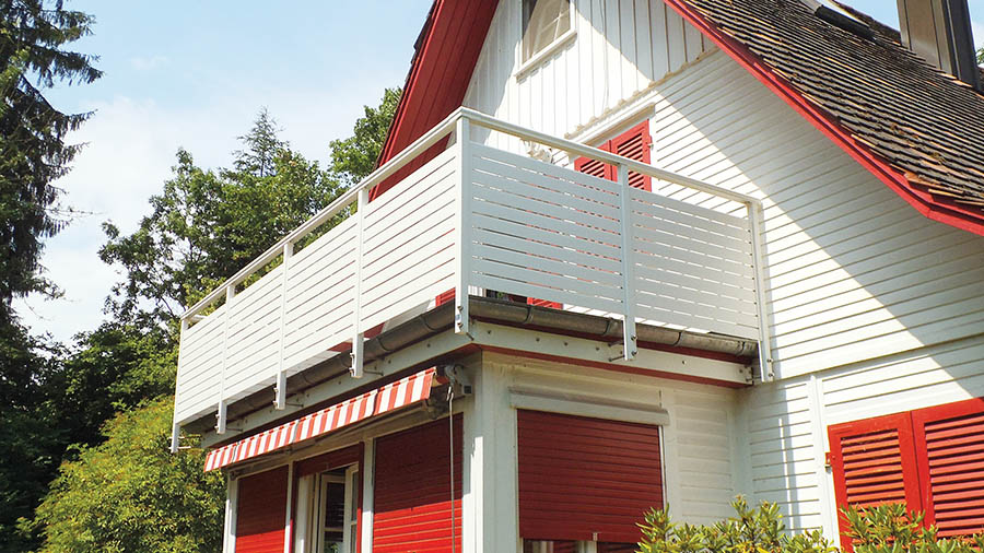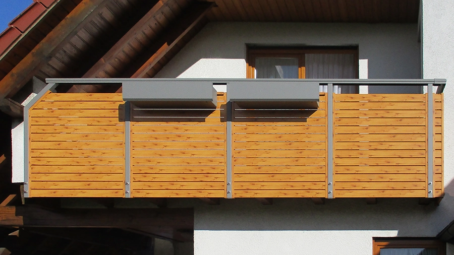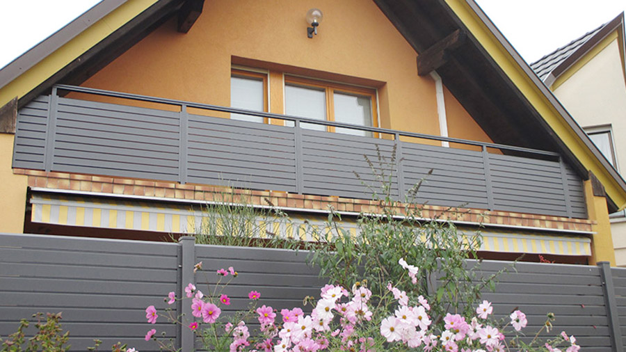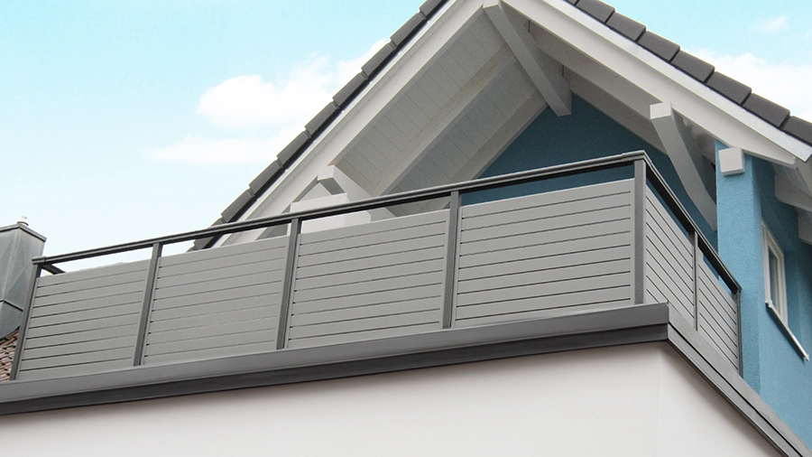 Dieser Alubalkon passt ideal zum modernen Gesamtauftritt Ihres Hauses. Die horizontal angeordneten Schrägprofile sorgen für designorientierte und geradlinige Optik.